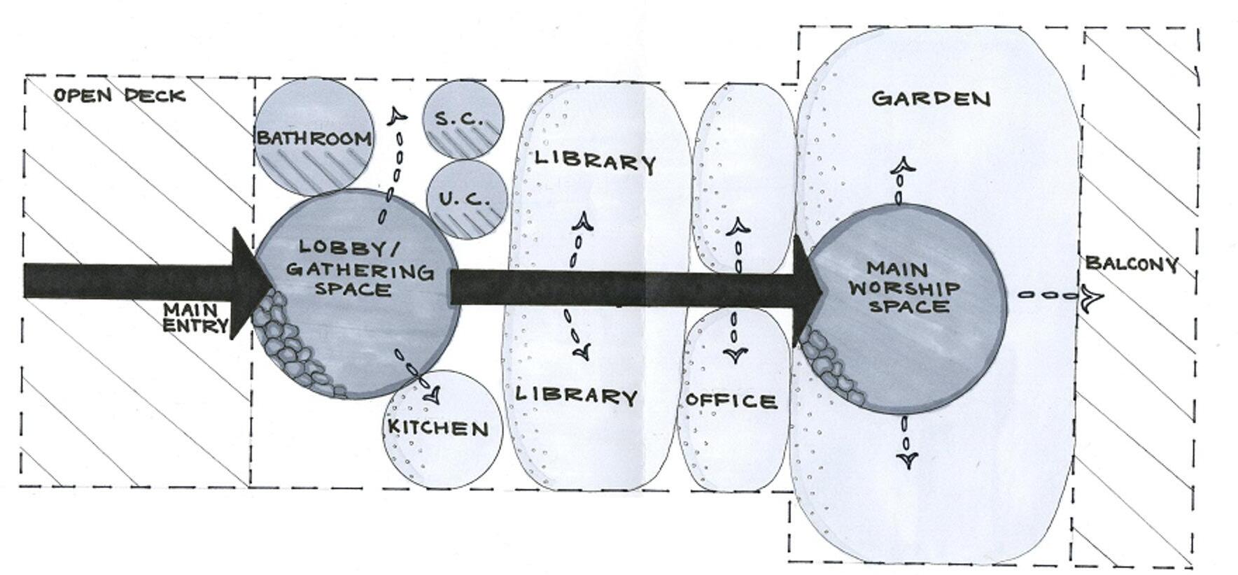 Process Work sketch depicting the path of travel getting more intense as the individual approaches the spiritual space. Both pass-by and pass-through spaces are present, although the central path stands alone to emphasize the importance of the final destination.