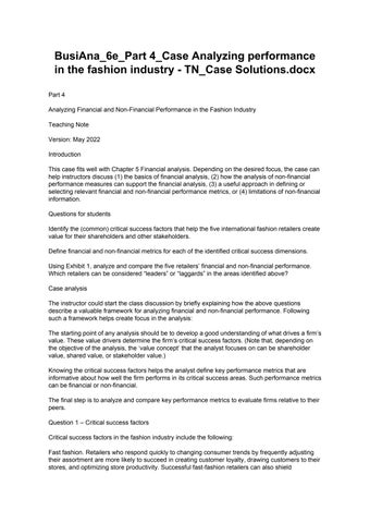 BusiAna_6e_Part 4_Case Analyzing performance in the fashion industry - TN_Case Solutions.docx Part 4 Analyzing Financial and Non-Financial Performance in the Fashion Industry Teaching Note Version: May 2022 Introduction This case fits well with Chapter 5 Financial analysis. Depending on the desired focus, the case can help instructors discuss (1) the basics of financial analysis, (2) how the analysis of non-financial performance measures can support the financial analysis, (3) a useful approach in defining or selecting relevant financial and non-financial performance metrics, or (4) limitations of non-financial information. Questions for students Identify the (common) critical success factors that help the five international fashion retailers create value for their shareholders and other stakeholders. Define financial and non-financial metrics for each of the identified critical success dimensions. Using Exhibit 1, analyze and compare the five retailers’ financial and non-financial performance. Which retailers can be considered “leaders” or “laggards” in the areas identified above? Case analysis The instructor could start the class discussion by briefly explaining how the above questions describe a valuable framework for analyzing financial and non-financial performance. Following such a framework helps create focus in the analysis: The starting point of any analysis should be to develop a good understanding of what drives a firm’s value. These value drivers determine the firm’s critical success factors. (Note that, depending on the objective of the analysis, the ‘value concept’ that the analyst focuses on can be shareholder value, shared value, or stakeholder value.) Knowing the critical success factors helps the analyst define key performance metrics that are informative about how well the firm performs in its critical success areas. Such performance metrics can be financial or non-financial. The final step is to analyze and compare key performance metrics to evaluate firms relative to their peers. Question 1 – Critical success factors Critical success factors in the fashion industry include the following: Fast fashion. Retailers who respond quickly to changing consumer trends by frequently adjusting their assortment are more likely to succeed in creating customer loyalty, drawing customers to their stores, and optimizing store productivity. Successful fast-fashion retailers can also shield