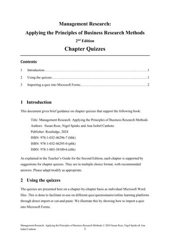 1 Introduction This document gives brief guidance on chapter quizzes that support the following book: Title: Management Research: Applying the Principles of Business Research Methods Authors: Susan Rose, Nigel Spinks and Ana Isobel Canhoto Publisher: Routledge, 2024 ISBN: 978-1-032-46296-7 (hbk) ISBN: 978-1-032-46295-0 (pbk) ISBN: 978-1-003-38100-6 (ebk) As explained in the Teacher’s Guide for the Second Edition, each chapter is supported by suggestions for chapter quizzes. They are in multiple choice format, with recommended answers. Please adapt/modify as appropriate.
