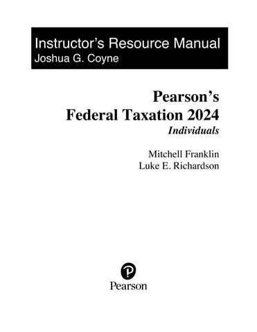 Enhance teaching and learning with the Instructor Solution Manual for Pearson's Federal Taxation 2024: Individuals, 37th Edition by Mitchell Franklin. This comprehensive instructor resource provides step-by-step solutions to all exercises, problems, and case studies, covering essential topics such as individual income taxation, tax planning, deductions, credits, retirement accounts, investment income, and compliance with federal tax laws. Designed specifically for instructors, it supports lecture preparation, assignment grading, and classroom discussions while helping students understand and apply individual taxation principles effectively. Perfect for accounting, finance, and taxation courses, this solution manual strengthens analytical thinking, problem-solving, and practical tax preparation skills, making it an essential tool for teaching contemporary federal taxation for individuals in both academic and professional settings.
