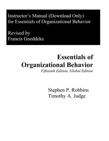 Enhance teaching and learning with the Instructor Solution Manual for Essentials of Organizational Behavior, Global Edition, 15th Edition by Stephen P. Robbins and Timothy A. Judge. This comprehensive instructor resource provides detailed, step-by-step solutions to all exercises, case studies, and discussion questions, covering essential topics such as motivation, leadership, team dynamics, communication, organizational culture, decision-making, and change management in a global context. Designed specifically for instructors, it supports lecture preparation, assignment grading, and classroom discussions while helping students understand and apply organizational behavior principles effectively. Perfect for management, business, and HR courses, this solution manual strengthens analytical thinking, problem-solving, and leadership skills, making it an essential tool for teaching contemporary organizational behavior concepts in today’s dynamic workplace.