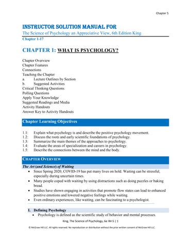 CHAPTER OVERVIEW The Art (and Science) of Waiting Since Spring 2020, COVID-19 has put many lives on hold. Waiting can be stressful, especially during uncertain times. Many people coped with waiting by using distractions such as doing puzzles or baking bread. Studies have shown engaging in activities that promote flow states can lead to enhanced positive emotions and lowered negative feelings while waiting. Even ordinary experiences, like waiting, can be fascinating to a psychologist. I. Defining Psychology Psychology is defined as the scientific study of behavior and mental processes. King, The Science of Psychology, 6e IM-5 | 1 © McGraw Hill LLC. All rights reserved. No reproduction or distribution without the prior written consent of McGraw Hill LLC.