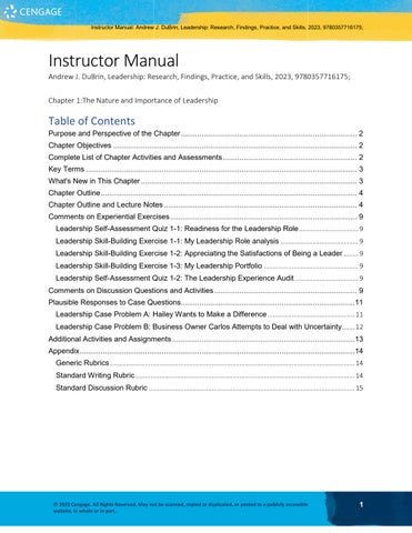 Table of Contents Purpose and Perspective ive of the Chapter ................................................................ .................................................... 2 Chapter Objectives ................................ ................................................................................................ .................................................... 2 Complete List of Chapter Activities and Assessments ................................................................ ................................ 2 Key Terms ................................................................ ................................................................................................ ................................. 3 What's New in This Chapter ................................ ................................................................................................ ....................................... 3 Chapter Outline ................................ .......................................................................................................................... .......................... 4 Chapter Outline and Lecture Notes ............................................................................................ ............................ 4 Comments on Experiential Exercises ......................................................................................... ......................... 9 Leadership Self-Assessment Assessment Quiz 1 1-1: Readiness for the Leadership Role ................................ 9 Leadership Skill-Building Building Exercise 1 1-1: My Leadership Role analysis .......................................... ................................ 9 Leadership Skill-Building Building Exercise 1 1-2: Appreciating the Satisfactions of Being a Leader ........ 9 Leadership Skill-Building Building Exercise 1 1-3: My Leadership Portfolio ................................................... ................................ 9 Leadership Self-Assessment Assessment Quiz 1 1-2: The Leadership Experience Audit .................................. ................................ 9 Comments on Discussion Questions and Activities ................................................................ .................................... 9 Plausible Responses to Case e Questions Questions................................................................ ...................................................11 Leadership Case Problem A: Hailey Wants to Make a Difference ............................................... ................................ 11 Leadership Case Problem B: Business Owner Carlos Attemp Attempts ts to Deal with Uncertainty....... 12 Additional Activities and Assignments ....................................................................................... .......................13 Appendix ................................................................ ................................................................................................ ...................................14 Generic Rubrics ................................ ................................................................................................................................ .................................... 14 Standard Writing Rubric ................................ ................................................................................................ ...................................................... 14 Standard Discussion Rubric ................................ ................................................................................................ ............................................... 15