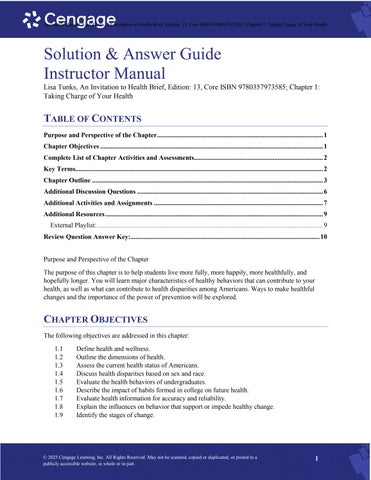 Solution & Answer Guide Instructor Manual Lisa Tunks, An Invitation to Health Brief, Edition: 13, Core ISBN 9780357973585; Chapter 1: Taking Charge of Your Health