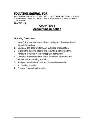 SOLUTION MANUAL FOR ACCOUNTING PRINCIPLES, VOLUME 1, 10TH CANADIAN EDITION JERRY J. WEYGANDT, PAUL D. KIMMEL, JILL E. MITCHELL, VALERIE WARREN, LORI NOVAK CHAPTER 1-10