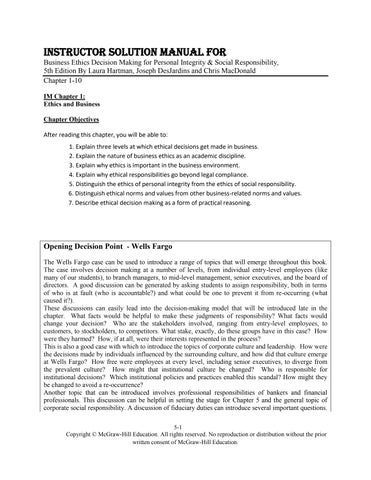 Instructor Solution Manual For Business Ethics Decision Making for Personal Integrity & Social Responsibility, 5th Edition By Laura Hartman, Joseph DesJardins and Chris MacDonald Chapter 1-10 IM Chapter 1: Ethics and Business Chapter Objectives After reading this chapter, you will be able to: 1. Explain three levels at which ethical decisions get made in business. 2. Explain the nature of business ethics as an academic discipline. 3. Explain why ethics is important in the business environment. 4. Explain why ethical responsibilities go beyond legal compliance. 5. Distinguish the ethics of personal integrity from the ethics of social responsibility. 6. Distinguish ethical norms and values from other business-related norms and values. 7. Describe ethical decision making as a form of practical reasoning.