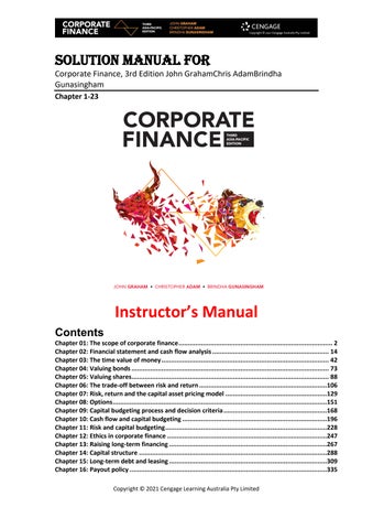 Instructor’s Manual Contents Chapter 01: The scope of corporate finance .................................................................................. 2 Chapter 02: Financial statement and cash flow analysis .............................................................. 14 Chapter 03: The time value of money ......................................................................................... 42 Chapter 04: Valuing bonds ......................................................................................................... 73 Chapter 05: Valuing shares......................................................................................................... 88 Chapter 06: The trade-off between risk and return ....................................................................106 Chapter 07: Risk, return and the capital asset pricing model ......................................................129 Chapter 08: Options ..................................................................................................................151 Chapter 09: Capital budgeting process and decision criteria .......................................................168 Chapter 10: Cash flow and capital budgeting .............................................................................196 Chapter 11: Risk and capital budgeting ......................................................................................228 Chapter 12: Ethics in corporate finance .....................................................................................247 Chapter 13: Raising long-term financing ....................................................................................267 Chapter 14: Capital structure ....................................................................................................288 Chapter 15: Long-term debt and leasing ....................................................................................309 Chapter 16: Payout policy .........................................................................................................335 Copyright © 2021 Cengage Learning Australia Pty Limited
