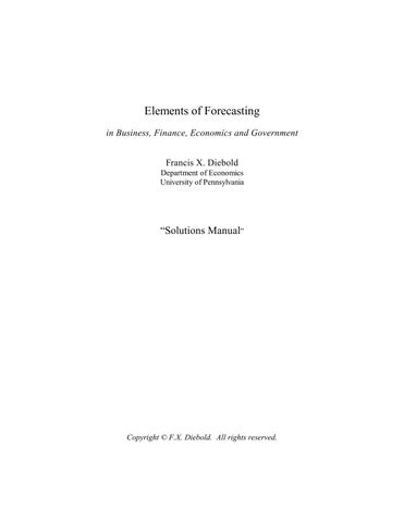 Download the complete Solution Manual for Elements of Forecasting, 4th Edition, a comprehensive academic resource designed to support students and instructors in mastering forecasting methods and time series analysis. This solution manual provides detailed, step-by-step solutions to problems covering qualitative forecasting, regression models, exponential smoothing, ARIMA models, seasonality, trend analysis, and forecast accuracy evaluation. Ideal for business, economics, statistics, data analytics, and operations management programs, it enhances exam preparation, classroom instruction, and practical understanding of predictive modeling techniques. Strengthen your analytical skills in demand forecasting, financial forecasting, and data-driven decision-making with this structured academic tool aligned with undergraduate and graduate forecasting curricula. Perfect for students seeking clear explanations and instructors aiming to streamline teaching and assessment in forecasting and applied statistics courses.
