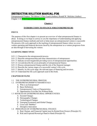 Instructor Solution Manual For Entrepreneurial Finance, 7th Edition J. Chris Leach (Author), Ronald W. Melicher (Author) Chapter 1-16 With Cases [Products Special] Chapter 1 INTRODUCTION TO FINANCE FOR ENTREPRENEURS FOCUS The purpose of this first chapter is to present an overview of what entrepreneurial finance is about. In doing so we hope to convey to you the importance of understanding and applying entrepreneurial finance methods and tools to help ensure an entrepreneurial venture is successful. We present a life cycle approach to the teaching of entrepreneurial finance where we cover venture operating and financial decisions faced by the entrepreneur as a venture progresses from an idea through to harvesting the venture. LEARNING OBJECTIVES LO 1.1: Characterize the entrepreneurial process. LO 1.2: Describe entrepreneurship and some characteristics of entrepreneurs. LO 1.3: Indicate several megatrends providing waves of entrepreneurial opportunities. LO 1.4: List and describe the seven principles of entrepreneurial finance. LO 1.5: Discuss entrepreneurial finance and the role of the financial manager. LO 1.6: Describe the various stages of a successful venture‘s life cycle. LO 1.7: Identify, by life cycle stage, the relevant types of financing and investors. LO 1.8: Understand the life cycle approach used in this book. CHAPTER OUTLINE 1.1 1.2