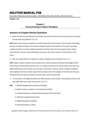 Answers to Chapter Review Questions 1. Based on what you have learned in this chapter, describe the kind of work environment you can expect to enter when you graduate. (L.O. 1.1) ANS: Expect a fast-moving, competitive, and information-driven environment. Communication technology provides unmatched mobility and connects individuals anytime and anywhere in the world. Increasing numbers of workers must be available practically around the clock and must respond quickly. Today's communicators interact using mobile devices and access information stored on remote servers in the cloud. 2. Why are writing skills more important in today’s workplace than ever before? (L.O. 1.1) ANS: People in today's workforce communicate more, not less, because information technology and the Internet have transformed the world of work. In a hyperconnected world, writing matters more than ever. Digital media require more written communication, and workers' skills are always on display. Employers seek employees who have a broad range of skills and high levels of knowledge in their field, and many job listings mention the need for excellent oral and written communication skills. 3.