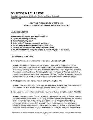 Solution Manual For Essentials of Economics 12e Bradley Schiller and Karen Gebhardt Chapter 1-17 CHAPTER 1: THE CHALLENGE OF ECONOMICS ANSWERS TO QUESTIONS FOR DISCUSSION AND PROBLEMS
