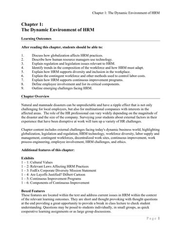 Chapter Overview Natural and manmade disasters can be unpredictable and have a ripple effect that is not only challenging for local employers, but also for multinational companies with interests in the affected areas. The role of the HR professional can vary widely depending on the magnitude of the disaster and the size of the company. Surveying your students about external factors in their experience that have been disruptive at work will turn up a variety of HR challenges. Chapter content includes external challenges facing today's dynamic business world, highlighting globalization, legislation and regulation, HRM technology, workforce diversity, labor supply and management, contingent workforces, decentralized work sites, continuous improvement, work process engineering, employee involvement, HRM challenges, and ethics. Additional features of this chapter: Exhibits 1 – 1: Cultural Values 1 – 2: Relevant Laws Affecting HRM Practices 1 – 3: FedEx Corporate Diversity Mission Statement 1 – 4: Are Layoffs Justified? Dilbert Cartoon 1 – 5: Continuous Improvement Programs 1 – 6: Components of Continuous Improvement Boxed Features These features are located within the text and address current issues in HRM within the context of the relevant learning outcomes. They are short and thought provoking with thought questions at the end providing a great opportunity to provide a break in class lecture to check student understanding. Questions may be posed to students individually, in small groups, as quick cooperative learning assignments or as large group discussions. Page 1