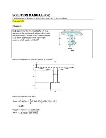 Solution Manual For Fundamentals of Structural Analysis Release 2025 Kenneth Leet Chapters 2-16 Chapter 2 P2.1. Determine the deadweight of a 1-ft-long segment of the prestressed, reinforced concrete tee-beam whose cross section is shown in Figure P2.1. Beam is constructed with lightweight concrete which weighs 120 lbs/ft3.