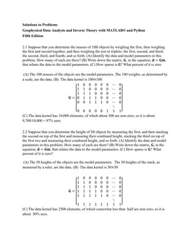 Solutions to Problems Geophysical Data Analysis and Inverse Theory with MATLAB® and Python Fifth Edition 2.1 Suppose that you determine the masses of 100 objects by weighing the first, then weighing the first and second together, and then weighing the rest in triplets: the first, second, and third; the second, third, and fourth; and so forth. (A) Identify the data and model parameters in this problem. How many of each are there? (B) Write down the matrix, 𝐆, in the equation, 𝐝 = 𝐆𝐦, that relates the data to the model parameters. (C) How sparse is 𝐆? What percent of it is zero (A) The 100 masses of the objects are the model parameters. The 100 weights, as determined by a scale, are the data. (B) The data kernel is 100×100 1 0 0 0 0 0 ⋯ 0 1 1 0 0 0 0 ⋯ 0 1 1 1 0 0 0 ⋯ 0 𝐆= 0 1 1 1 0 0 ⋯ 0 0 0 1 1 1 0 ⋯ 0 ⋱ [0 0 0 0 0 1 1 1 ] (C) The data kernel has 10,000 elements, of which about 300 are non-zero, so it is about 9,700/10,000 = 97% zero. 2.2 Suppose that you determine the height of 50 objects by measuring the first, and then stacking the second on top of the first and measuring their combined height, stacking the third on top of the first two and measuring their combined height, and so forth. (A) Identify the data and model parameters in this problem. How many of each are there? (B) Write down the matrix, 𝐆, in the equation, 𝐝 = 𝐆𝐦, that relates the data to the model parameters. (C) How sparse is 𝐆? What percent of it is zero? (A) The 50 heights of the objects are the model parameters. The 50 heights of the stack, as measured by a ruler, are the data. (B) The data kernel is 50×50 1 1 1 𝐆= 1 1