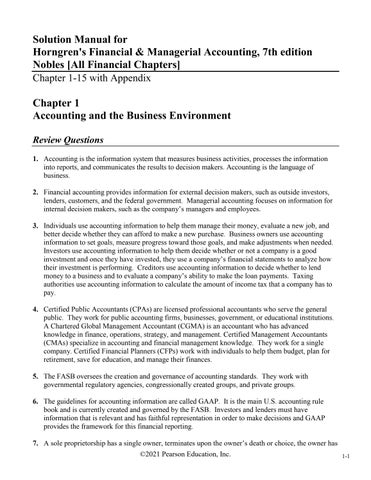 Chapter 1 Accounting and the Business Environment Review Questions 1. Accounting is the information system that measures business activities, processes the information into reports, and communicates the results to decision makers. Accounting is the language of business. 2. Financial accounting provides information for external decision makers, such as outside investors, lenders, customers, and the federal government. Managerial accounting focuses on information for internal decision makers, such as the company’s managers and employees. 3. Individuals use accounting information to help them manage their money, evaluate a new job, and better decide whether they can afford to make a new purchase. Business owners use accounting information to set goals, measure progress toward those goals, and make adjustments when needed. Investors use accounting information to help them decide whether or not a company is a good investment and once they have invested, they use a company’s financial statements to analyze how their investment is performing. Creditors use accounting information to decide whether to lend money to a business and to evaluate a company’s ability to make the loan payments. Taxing authorities use accounting information to calculate the amount of income tax that a company has to pay. 4. Certified Public Accountants (CPAs) are licensed professional accountants who serve the general public. They work for public accounting firms, businesses, government, or educational institutions. A Chartered Global Management Accountant (CGMA) is an accountant who has advanced knowledge in finance, operations, strategy, and management. Certified Management Accountants (CMAs) specialize in accounting and financial management knowledge. They work for a single company. Certified Financial Planners (CFPs) work with individuals to help them budget, plan for retirement, save for education, and manage their finances. 5. The FASB oversees the creation and governance of accounting standards. They work with governmental regulatory agencies, congressionally created groups, and private groups. 6. The guidelines for accounting information are called GAAP. It is the main U.S. accounting rule book and is currently created and governed by the FASB. Investors and lenders must have information that is relevant and has faithful representation in order to make decisions and GAAP provides the framework for this financial reporting. 7. A sole proprietorship has a single owner, terminates upon the owner’s death or choice, the owner has ©2021 Pearson Education, Inc.
