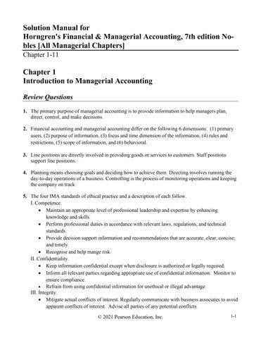 Chapter 1 Introduction to Managerial Accounting Review Questions 1. The primary purpose of managerial accounting is to provide information to help managers plan, direct, control, and make decisions. 2. Financial accounting and managerial accounting differ on the following 6 dimensions: (1) primary users, (2) purpose of information, (3) focus and time dimension of the information, (4) rules and restrictions, (5) scope of information, and (6) behavioral. 3. Line positions are directly involved in providing goods or services to customers. Staff positions support line positions. 4. Planning means choosing goals and deciding how to achieve them. Directing involves running the day-to-day operations of a business. Controlling is the process of monitoring operations and keeping the company on track. 5. The four IMA standards of ethical practice and a description of each follow. I. Competence. Maintain an appropriate level of professional leadership and expertise by enhancing knowledge and skills. Perform professional duties in accordance with relevant laws, regulations, and technical standards. Provide decision support information and recommendations that are accurate, clear, concise, and timely. Recognise and help mange risk. II. Confidentiality. Keep information confidential except when disclosure is authorized or legally required. Inform all relevant parties regarding appropriate use of confidential information. Monitor to ensure compliance. Refrain from using confidential information for unethical or illegal advantage. III. Integrity. Mitigate actual conflicts of interest. Regularly communicate with business associates to avoid apparent conflicts of interest. Advise all parties of any potential conflicts. © 2021 Pearson Education, Inc.