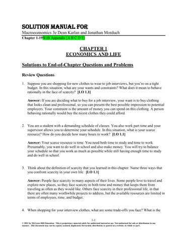 CHAPTER 1 ECONOMICS AND LIFE Solutions to End-of-Chapter Questions and Problems Review Questions 1. Suppose you are shopping for new clothes to wear to job interviews, but you’re on a tight budget. In this situation, what are your wants and constraints? What does it mean to behave rationally in the face of scarcity? [LO 1.1] Answer: If you are deciding what to buy for a job interview, your want is to buy clothing that looks clean and professional, so you can present the best possible impression to potential employers. Your constraint is the amount of money you can spend on this clothing. A person behaving rationally would buy the nicest clothes they could afford.