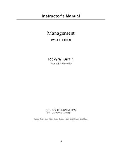 Develop a comprehensive understanding of management principles with this Solution Manual for Management, 12th Edition by Ricky W. Griffin. This manual provides detailed, step-by-step solutions to exercises, case studies, and applied problems from the textbook, helping students and instructors master key management concepts and practices.