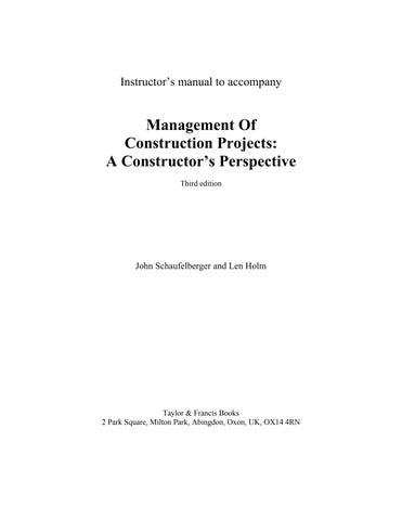 This Solution Manual is a complete academic companion designed to support students and instructors using Management of Construction Projects: A Constructor's Perspective. Covering Chapters 1 through 18, it provides detailed, step-by-step solutions and explanations for all exercises, case studies, and practical problems in the textbook, reinforcing both theoretical concepts and real-world construction management practices.