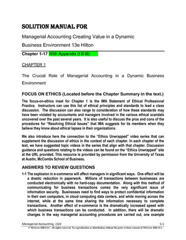 Solution Manual For Managerial Accounting Creating Value in a Dynamic Business Environment 13e Hilton Chapter 1-17 With Appendix (I II III) CHAPTER 1 The Crucial Role of Managerial Accounting in a Dynamic Business Environment FOCUS ON ETHICS (Located before the Chapter Summary in the text.) The focus-on-ethics inset for Chapter 1 is the IMA Statement of Ethical Professional Practice. Instructors can use this list of ethical principles and standards to lead a class discussion. The discussion can also range to consideration of how these standards may have been violated by accountants and managers involved in the various ethical scandals uncovered over the past several years. It is also useful to discuss the pros and cons of the procedures for ―Resolving Ethical Issues‖ that IMA suggests for its members when they believe they know about ethical lapses in their organizations. We also introduce here the connection to the ―Ethics Unwrapped‖ video series that can supplement the discussion of ethics in the context of each chapter. In each chapter of the text, we have suggested topic videos in the series that align with that chapter. Discussion guidance and questions relating to the videos can be found on the ―Ethics Unwrapped‖ site at the URL provided. This resource is provided by permission from the University of Texas at Austin, McCombs School of Business.