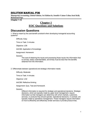 Chapter 1 EOC Questions and Solutions Discussion Questions 1. What is meant by the cost-benefit constraint when developing managerial accounting systems? Difficulty: Easy Time on Task: 3 minutes Objective: LO6 AACSB: Application of knowledge Assignment: Homework Solution: The cost of obtaining the inputs and processing those inputs into information that is concise, easily understandable, and timely must be less than the benefits obtained from the information.