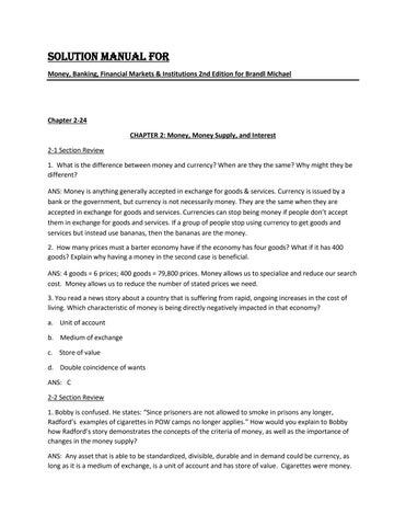 Chapter 2-24 CHAPTER 2: Money, Money Supply, and Interest 2-1 Section Review 1. What is the difference between money and currency? When are they the same? Why might they be different? ANS: Money is anything generally accepted in exchange for goods & services. Currency is issued by a bank or the government, but currency is not necessarily money. They are the same when they are accepted in exchange for goods and services. Currencies can stop being money if people don’t accept them in exchange for goods and services. If a group of people stop using currency to get goods and services but instead use bananas, then the bananas are the money. 2. How many prices must a barter economy have if the economy has four goods? What if it has 400 goods? Explain why having a money in the second case is beneficial. ANS: 4 goods = 6 prices; 400 goods = 79,800 prices. Money allows us to specialize and reduce our search cost. Money allows us to reduce the number of stated prices we need. 3. You read a news story about a country that is suffering from rapid, ongoing increases in the cost of living. Which characteristic of money is being directly negatively impacted in that economy? a. Unit of account b. Medium of exchange c. Store of value d. Double coincidence of wants ANS: C 2-2 Section Review 1. Bobby is confused. He states: “Since prisoners are not allowed to smoke in prisons any longer, Radford’s examples of cigarettes in POW camps no longer applies.” How would you explain to Bobby how Radford’s story demonstrates the concepts of the criteria of money, as well as the importance of changes in the money supply? ANS: Any asset that is able to be standardized, divisible, durable and in demand could be currency, as long as it is a medium of exchange, is a unit of account and has store of value. Cigarettes were money.