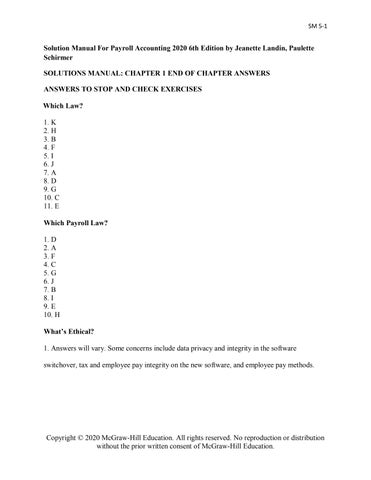 Solution Manual For Payroll Accounting 2020 6th Edition by Jeanette Landin, Paulette Schirmer SOLUTIONS MANUAL: CHAPTER 1 END OF CHAPTER ANSWERS ANSWERS TO STOP AND CHECK EXERCISES Which Law? 1. K 2. H 3. B 4. F 5. I 6. J 7. A 8. D 9. G 10. C 11. E Which Payroll Law? 1. D 2. A 3. F 4. C 5. G 6. J 7. B 8. I 9. E 10. H What’s Ethical? 1. Answers will vary. Some concerns include data privacy and integrity in the software switchover, tax and employee pay integrity on the new software, and employee pay methods.