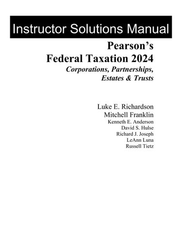 The Solution Manual for Pearson's Federal Taxation 2024: Corporations, Partnerships, Estates, & Trusts, 37th Edition by Franklin Mitchell and Luke E. Richardson is a comprehensive academic resource designed to help students and instructors master federal taxation concepts for businesses and estates. Covering Chapters 1–15, this manual provides detailed, step-by-step solutions for exercises, case studies, and problem sets, including topics such as corporate taxation, partnership taxation, estate and trust taxation, income recognition, deductions, credits, and compliance with IRS regulations. Each solution is carefully structured to reinforce theoretical understanding while promoting practical application in real-world tax planning and reporting scenarios. Ideal for exam preparation, assignments, and classroom instruction, this solution manual enhances analytical, critical thinking, and problem-solving skills. It serves as a valuable companion for undergraduate and graduate courses in accounting, taxation, and