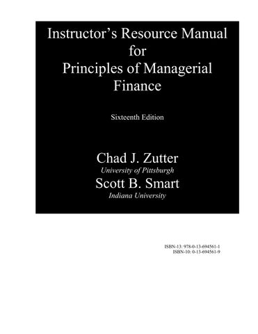This Solution Manual for Principles of Managerial Finance, 16th Edition (Chapters 1–8) by Chad J. Zutter and Scott Smart is a comprehensive resource for students and instructors in finance, accounting, and business courses. Covering the first eight chapters, it provides step-by-step solutions for exercises on financial statements, time value of money, risk and return, valuation of bonds and stocks, financial markets, and capital budgeting fundamentals.