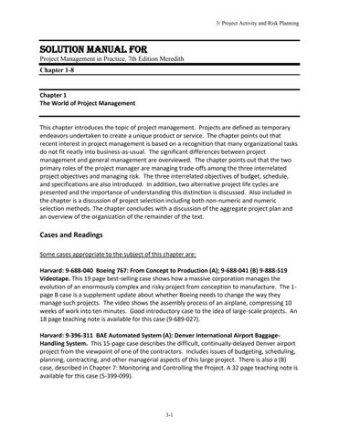 Cases and Readings Some cases appropriate to the subject of this chapter are: Harvard: 9-688-040 Boeing 767: From Concept to Production (A); 9-688-041 (B) 9-888-519 Videotape. This 19 page best-selling case shows how a massive corporation manages the evolution of an enormously complex and risky project from conception to manufacture. The 1page B case is a supplement update about whether Boeing needs to change the way they manage such projects. The video shows the assembly process of an airplane, compressing 10 weeks of work into ten minutes. Good introductory case to the idea of large-scale projects. An 18 page teaching note is available for this case (9-689-027). Harvard: 9-396-311 BAE Automated System (A): Denver International Airport BaggageHandling System. This 15-page case describes the difficult, continually-delayed Denver airport project from the viewpoint of one of the contractors. Includes issues of budgeting, scheduling, planning, contracting, and other managerial aspects of this large project. There is also a (B) case, described in Chapter 7: Monitoring and Controlling the Project. A 32 page teaching note is available for this case (5-399-099).