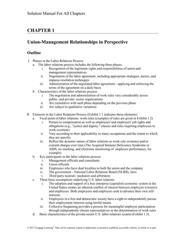 CHAPTER 1 Union-Management Relationships in Perspective Outline I. Phases in the Labor Relations Process a. The labor relations process includes the following three phases: i. Recognition of the legitimate rights and responsibilities of union and management representatives ii. Negotiation of the labor agreement, including appropriate strategies, tactics, and impasse-resolution techniques iii. Administration of the negotiated labor agreement—applying and enforcing the terms of the agreement on a daily basis b. Characteristics of the labor relations process i. The negotiation and administration of work rules vary considerably across public- and private- sector organizations ii. Are cumulative with each phase depending on the previous phase iii. Are subject to qualitative variations II. Elements in the Labor Relations Process (Exhibit 1.1 indicates these elements) a. Focal point of labor relations: work rules (examples of rules are given in Exhibit 1.2) i. Pertain to compensation as well as employees' and employers' job rights and obligations (e.g., "justice and dignity," clauses and rules requiring employees to work overtime) ii. Vary according to their applicability to many occupations and the extent to which they are specific iii. Reflect the dynamic nature of labor relations as work rule existence and/or consent charges over time (The Acquired Immune Deficiency Syndrome or AIDS, no smoking, and electronic monitoring of employee performance, for example) b. Key participants in the labor relations process i. Management officials and consultants ii. Union officials iii. Employees who have dual loyalties to both the union and the company iv. The government—National Labor Relations Board (NLRB), laws v. Third party neutrals: mediators and arbitrators c. Three basic assumptions underlying U.S. labor relations i. The adoption and support of a free enterprise (capitalist) economic system in the United States creates an inherent conflict of interest between employers (owners) and employees. Both employees and employers seek to advance their own selfinterests ii. Employees in a free and democratic society have a right to independently pursue their employment interests using lawful means iii. Collective bargaining provides a process for meaningful employee participation through independently chosen representatives in the determination of work rules d. Basic characteristics of the private-sector U.S. labor relations system (Exhibit 1.3):