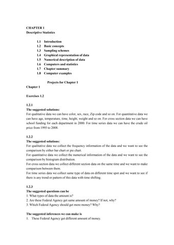 CHAPTER 1 Descriptive Statistics 1.1 Introduction 1.2 Basic concepts 1.3 Sampling schemes 1.4 Graphical representation of data 1.5 Numerical description of data 1.6 Computers and statistics 1.7 Chapter summary 1.8 Computer examples Projects for Chapter 1 Chapter 1 Exercises 1.2 1.2.1 The suggested solutions: For qualitative data we can have color, sex, race, Zip code and so on. For quantitative data we can have age, temperature, time, height, weight and so on. For cross section data we can have school funding for each department in 2000. For time series data we can have the crude oil price from 1995 to 2008. 1.2.2 The suggested solutions: For qualitative data we collect the frequency information of the data and we want to see the comparison by either bar chart or pie chart. For quantitative data we collect the numerical information of the data and we want to see the comparison by histogram distribution. For cross section data we collect different section data on the same time and we want to make comparison between them. For time series data we collect same type of data on different time spot and we want to see if there is any trend or pattern of this data with time shifting. 1.2.3 The suggested questions can be 1. What types of data the amount is? 2. Are these Federal Agency get same amount of money? If not, why? 3. Which Federal Agency should get more money? Why? The suggested inferences we can make is 1. These Federal Agency get different amount of money.
