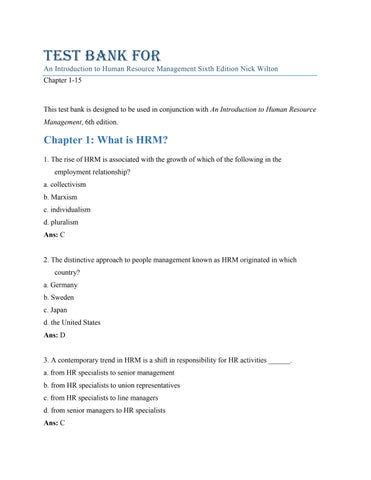 Chapter 1: What is HRM? 1. The rise of HRM is associated with the growth of which of the following in the employment relationship? a. collectivism b. Marxism c. individualism d. pluralism Ans: C
