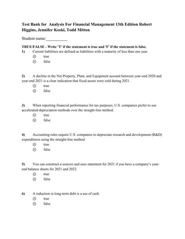 Test Bank for Analysis For Financial Management 13th Edition Robert Higgins, Jennifer Koski, Todd Mitton Student name:__________ TRUE/FALSE - Write 'T' if the statement is true and 'F' if the statement is false. 1) Current liabilities are defined as liabilities with a maturity of less than one year. ⊚ true ⊚ false