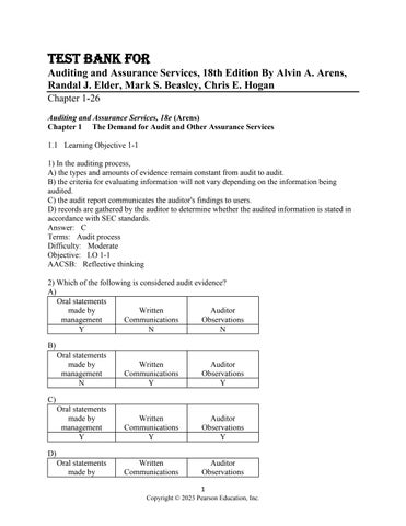 Test Bank For Auditing and Assurance Services, 18th Edition By Alvin A. Arens, Randal J. Elder, Mark S. Beasley, Chris E. Hogan Chapter 1-26 Auditing and Assurance Services, 18e (Arens) Chapter 1 The Demand for Audit and Other Assurance Services 1.1 Learning Objective 1-1 1) In the auditing process, A) the types and amounts of evidence remain constant from audit to audit. B) the criteria for evaluating information will not vary depending on the information being audited. C) the audit report communicates the auditor's findings to users. D) records are gathered by the auditor to determine whether the audited information is stated in accordance with SEC standards. Answer: C Terms: Audit process Difficulty: Moderate Objective: LO 1-1 AACSB: Reflective thinking 2) Which of the following is considered audit evidence? A) Oral statements made by Written Auditor management Communications Observations Y N N B) Oral statements made by management N