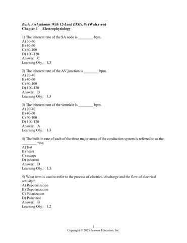 Basic Arrhythmias With 12-Lead EKGs, 9e (Walraven) Chapter 1 Electrophysiology 1) The inherent rate of the SA node is ________ bpm. A) 30-60 B) 40-60 C) 60-100 D) 100-120 Answer: C Learning Obj.: 1.3 2) The inherent rate of the AV junction is ________ bpm. A) 20-40 B) 40-60 C) 60-100 D) 100-120 Answer: B Learning Obj.: 1.3 3) The inherent rate of the ventricle is ________ bpm. A) 20-40 B) 40-60 C) 60-100 D) 100-120 Answer: A Learning Obj.: 1.3 4) The built-in rate of each of the three major areas of the conduction system is referred to as the ________ rate. A) fast B) heart C) escape D) inherent Answer: D Learning Obj.: 1.3 5) What term is used to refer to the process of electrical discharge and the flow of electrical activity? A) Repolarization B) Depolarization C) Polarization D) Polarized Answer: B Learning Obj.: 1.2
