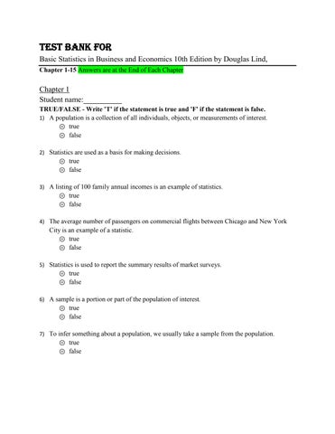 Test Bank For Basic Statistics in Business and Economics 10th Edition by Douglas Lind, Chapter 1-15 Answers are at the End of Each Chapter