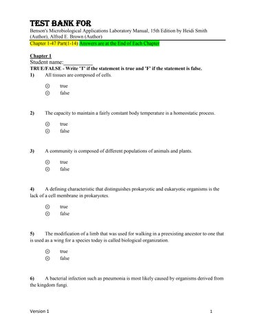 Test Bank For Benson's Microbiological Applications Laboratory Manual, 15th Edition by Heidi Smith (Author), Alfred E. Brown (Author) Chapter 1-47 Part(1-14) Answers are at the End of Each Chapter Chapter 1
