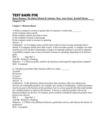 TEST BANK FOR Better Business, 7th edition Michael R. Solomon Mary Anne Poatsy Kendall Martin Chapters 1-16 Chapter 1 Business Basics 1) When a company's revenue is greater than its expenses, it means that ________. A) the company earns a profit B) the company spends more than it earns C) the company's income is decreasing D) the company needs to increase its spending Answer: A Explanation: A) A company earns a profit when it takes in more revenue (earnings) than it spends. If a company spends more than it earns, it does not make a profit. A company can make a profit even if its income is decreasing, as long as its earnings continue to exceed its expenses. A profitable company may or may not need to increase its spending, depending on its business goals. Diff: 1 Page Ref: 3 AACSB: Reflective Thinking Objective: 1-1 What are profits, and how do businesses and nonprofit organizations compare? Skill: Conceptual 2) The physical products that a business offers are called ________. A) goods B) services C) assets D) devices Answer: A Explanation: A) By definition, physical products that a business offers are called goods. Services are nontangible products, for example, hair styling or bookkeeping. A physical product may be an asset to the business or the purchaser, but it is a more general term that could include any valuable product or aspect of the business. A device is a physical product, but not all physical products are devices. For instance, pizza would be considered a physical product, but a pizza is not a device. Diff: 1 Page Ref: 4 AACSB: Reflective Thinking Objective: 1-2 What is the difference between a good and a service, and what are the factors of production? Skill: Conceptual