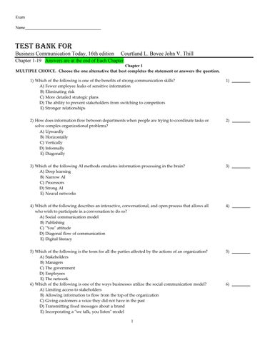 Chapter 1-19 Answers are at the end of Each Chapter Chapter 1 MULTIPLE CHOICE. Choose the one alternative that best completes the statement or answers the question. 1) Which of the following is one of the benefits of strong communication skills? A) Fewer employee leaks of sensitive information B) Eliminating risk C) More detailed strategic plans D) The ability to prevent stakeholders from switching to competitors E) Stronger relationships