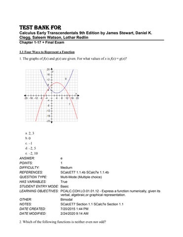 Test Bank for Calculus Early Transcendentals 9th Edition by James Stewart, Daniel K. Clegg, Saleem Watson, Lothar Redlin Chapter 1-17 + Final Exam 1.1 Four Ways to Represent a Function 1. The graphs of f(x) and g(x) are given. For what values of x is f(x) = g(x)?