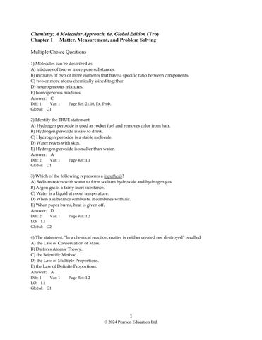 Chemistry: A Molecular Approach, 6e, Global Edition (Tro) Chapter 1 Matter, Measurement, and Problem Solving Multiple Choice Questions 1) Molecules can be described as A) mixtures of two or more pure substances. B) mixtures of two or more elements that have a specific ratio between components. C) two or more atoms chemically joined together. D) heterogeneous mixtures. E) homogeneous mixtures. Answer: C Diff: 1 Var: 1 Global: G1