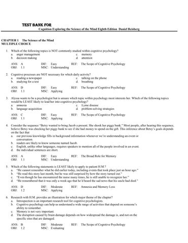 CHAPTER 1 The Science of the Mind MULTIPLE CHOICE 1. Which of the following topics is NOT commonly studied within cognitive psychology? a. anger management c. memory b. decision making d. attention ANS: A OBJ: 1.1