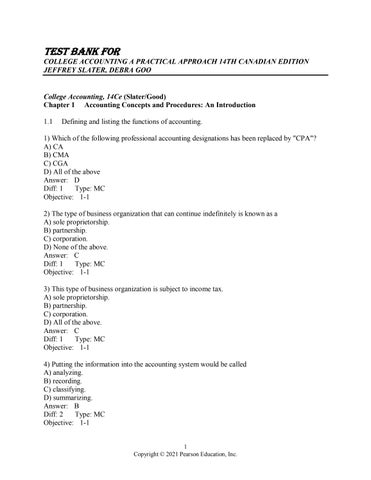 1) Which of the following professional accounting designations has been replaced by "CPA"? A) CA B) CMA C) CGA D) All of the above Answer: D Diff: 1 Type: MC Objective: 1-1 2) The type of business organization that can continue indefinitely is known as a A) sole proprietorship. B) partnership. C) corporation. D) None of the above. Answer: C Diff: 1 Type: MC Objective: 1-1 3) This type of business organization is subject to income tax. A) sole proprietorship. B) partnership. C) corporation. D) All of the above. Answer: C Diff: 1 Type: MC Objective: 1-1 4) Putting the information into the accounting system would be called A) analyzing. B) recording. C) classifying. D) summarizing. Answer: B Diff: 2 Type: MC Objective: 1-1 1 Copyright © 2021 Pearson Education, Inc.