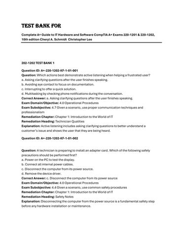 202-1202 TEST BANK 1 Question ID: A+-220-1202-KF-1-01-001 Question: Which actions best demonstrate active listening when helping a frustrated user? a. Asking clarifying questions after the user finishes speaking. b. Avoiding eye contact to focus on documentation. c. Interrupting to offer a quick solution. d. Multitasking by checking phone notifications during the conversation. Correct Answer: a. Asking clarifying questions after the user finishes speaking. Exam Domain/Objective: 4.0 Operational Procedures Exam Subobjective: 4.7 Given a scenario, use proper communication techniques and professionalism Remediation Chapter: Chapter 1: Introduction to the World of IT Remediation Heading: Technician Qualities Explanation: Active listening includes asking clarifying questions to better understand a customer’s issue and shows the user that they are being heard. Question ID: A+-220-1202-KF-1-01-002 Question: A technician is preparing to install an adapter card. Which of the following safety precautions should be performed first? a. Power on the PC to test the display. b. Connect all internal power cables. c. Disconnect the computer from its power source. d. Remove the device driver. Correct Answer: c. Disconnect the computer from its power source Exam Domain/Objective: 4.0 Operational Procedures Exam Subobjective: 4.4 Given a scenario, use common safety procedures Remediation Chapter: Chapter 1: Introduction to the World of IT Remediation Heading: Safety Notes Explanation: Disconnecting the computer from the power source is a fundamental safety step before any hardware installation or maintenance.