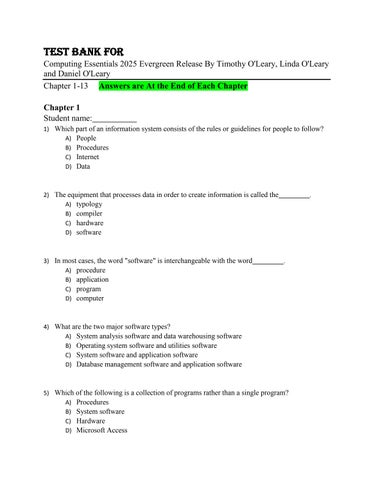 Test Bank For Computing Essentials 2025 Evergreen Release By Timothy O'Leary, Linda O'Leary and Daniel O'Leary Chapter 1-13 Answers are At the End of Each Chapter Chapter 1 Student name: 1) Which part of an information system consists of the rules or guidelines for people to follow? A) People B) Procedures C) Internet D) Data