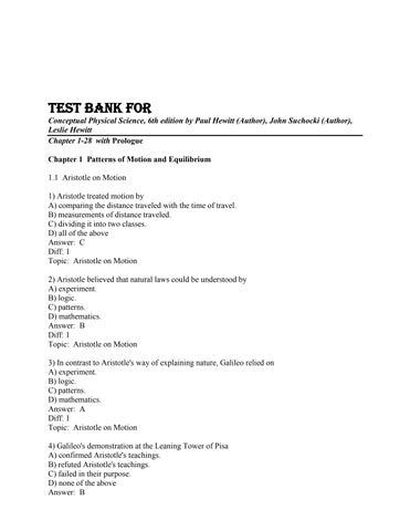 Test Bank For Conceptual Physical Science, 6th edition by Paul Hewitt (Author), John Suchocki (Author), Leslie Hewitt Chapter 1-28 with Prologue Chapter 1 Patterns of Motion and Equilibrium 1.1 Aristotle on Motion 1) Aristotle treated motion by A) comparing the distance traveled with the time of travel. B) measurements of distance traveled. C) dividing it into two classes. D) all of the above Answer: C Diff: 1 Topic: Aristotle on Motion 2) Aristotle believed that natural laws could be understood by A) experiment. B) logic. C) patterns. D) mathematics. Answer: B Diff: 1 Topic: Aristotle on Motion 3) In contrast to Aristotle's way of explaining nature, Galileo relied on A) experiment. B) logic. C) patterns. D) mathematics. Answer: A Diff: 1 Topic: Aristotle on Motion 4) Galileo's demonstration at the Leaning Tower of Pisa A) confirmed Aristotle's teachings. B) refuted Aristotle's teachings. C) failed in their purpose. D) none of the above Answer: B