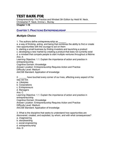 Test Bank For Entrepreneurship The Practice and Mindset 3th Edition by Heidi M. Neck, Christopher P. Neck, Emma L. Murray Chapter 1-16