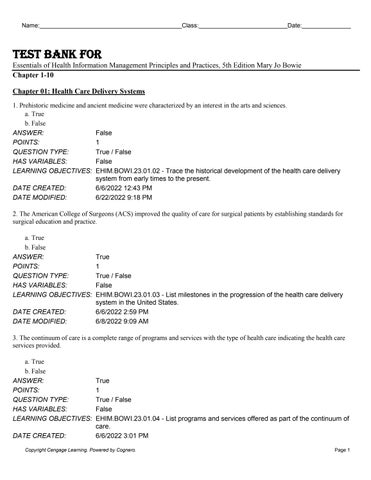 Test Bank For Essentials of Health Information Management Principles and Practices, 5th Edition Mary Jo Bowie Chapter 1-10 Chapter 01: Health Care Delivery Systems 1. Prehistoric medicine and ancient medicine were characterized by an interest in the arts and sciences. a. True b. False ANSWER: False POINTS: 1 QUESTION TYPE: True / False HAS VARIABLES: False LEARNING OBJECTIVES: EHIM.BOWI.23.01.02 - Trace the historical development of the health care delivery system from early times to the present. DATE CREATED: 6/6/2022 12:43 PM DATE MODIFIED: 6/22/2022 9:18 PM 2. The American College of Surgeons (ACS) improved the quality of care for surgical patients by establishing standards for surgical education and practice. a. True b. False ANSWER: True POINTS: 1 QUESTION TYPE: True / False HAS VARIABLES: False LEARNING OBJECTIVES: EHIM.BOWI.23.01.03 - List milestones in the progression of the health care delivery system in the United States. DATE CREATED: 6/6/2022 2:59 PM DATE MODIFIED: 6/8/2022 9:09 AM 3. The continuum of care is a complete range of programs and services with the type of health care indicating the health care services provided. a. True b. False ANSWER: True POINTS: 1 QUESTION TYPE: True / False HAS VARIABLES: False LEARNING OBJECTIVES: EHIM.BOWI.23.01.04 - List programs and services offered as part of the continuum of care. DATE CREATED: 6/6/2022 3:01 PM Copyright Cengage Learning. Powered by Cognero.