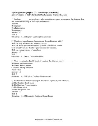Exploring Microsoft Office 365: Introductory 2025 (Poatsy) Access Chapter 1 Introduction to Databases and Microsoft Access 1) Database ________ are employees who are database experts who manage the database data and ensure the security of that organization's data. A) users B) engineers C) administrators D) managers Answer: C Diff: 2 Objective: A1.01 Explore Database Fundamentals 2) What is not true about the Compact and Repair Database utility? A) It can help when the data becomes corrupt. B) It can be set up to run automatically when a database is closed. C) It is used when the database gets too many records in it. D) It can reduce the size of a database. Answer: C Diff: 2 Objective: A1.04 Use Database Utilities 3) When you click the Enable Content warning, the database is now ________. A) trusted on this computer B) trusted for this session C) trusted for any computer D) unlocked Answer: A Diff: 2 Objective: A1.01 Explore Database Fundamentals 4) What interface element shows you the various objects in your database? A) The Database Tools menu B) The Database Properties pane C) The Home menu D) The Navigation Pane Answer: D Diff: 2 Objective: A1.02 Recognize Database Object Types
